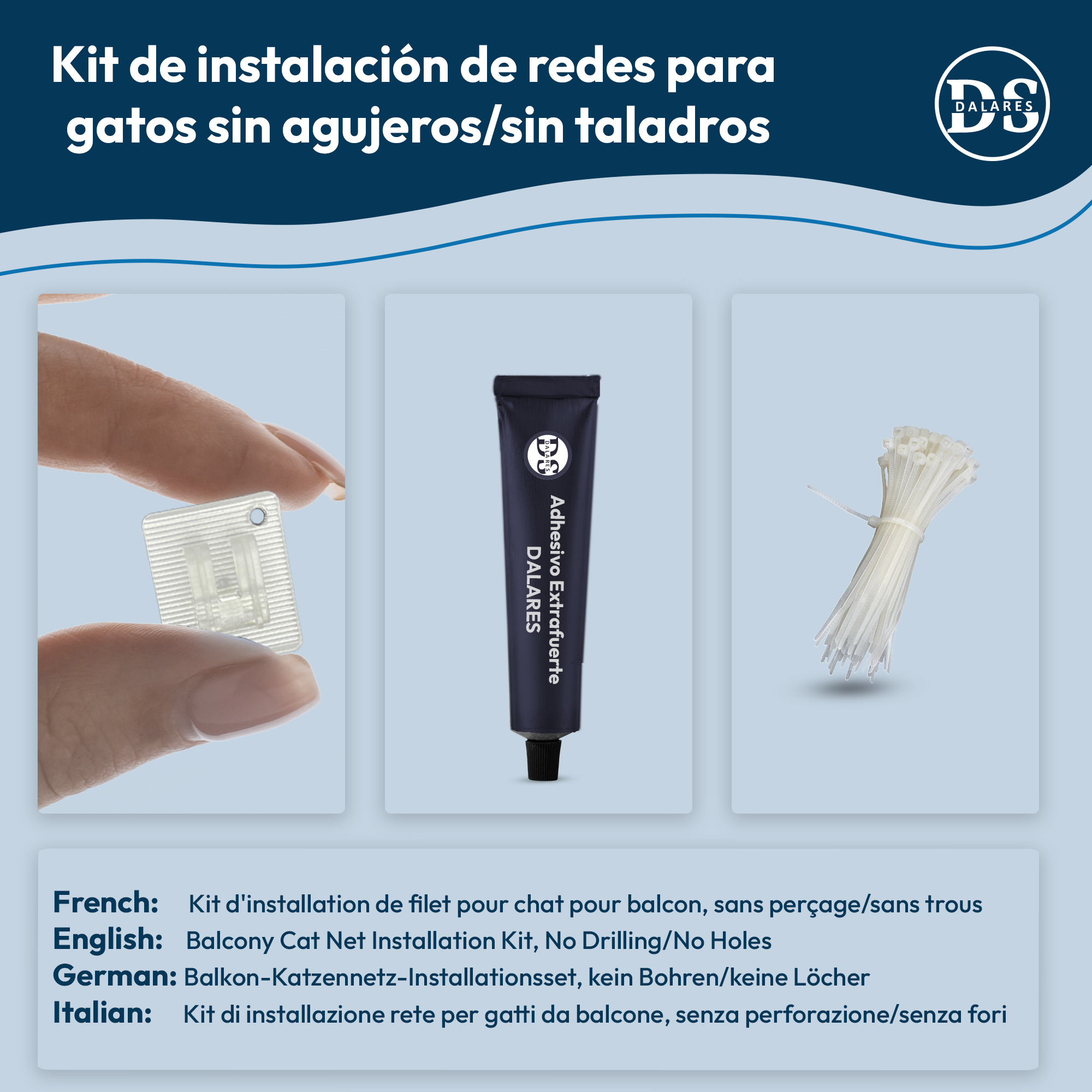 Este pack incluye una red de protección para balcón , un Kit Dalares de fijación sin taladros con 60 ganchos adhesivos, 30 bridas y pegamento extrafuerte con sólo una espera de 4/12 horas y kit de fijación con taladro 25 ganchos metálicos, 25 tacos, 25 bridas, y 25 metros de cuerda